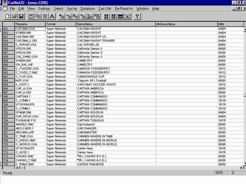Cartlist32 is a utility that manages your growing collection of ROM images. It automatically extracts name information from Super Nintendo, Gameboy, Sega Genesis, and Nintendo 64 images and presents them in a windowed listing. It can also generate name information for other types of consoles using the naming databases below. It's as easy as dragging and dropping your files from Explorer onto Cartlist32. It will automatically create lists of your games that can be compared, sorted, and merged. Duplicates can also be found and removed. For a more thorough explanation of what Cartlist32 can do (eg console utilities, importing, and loads of other features) take a look at the User Manual here.